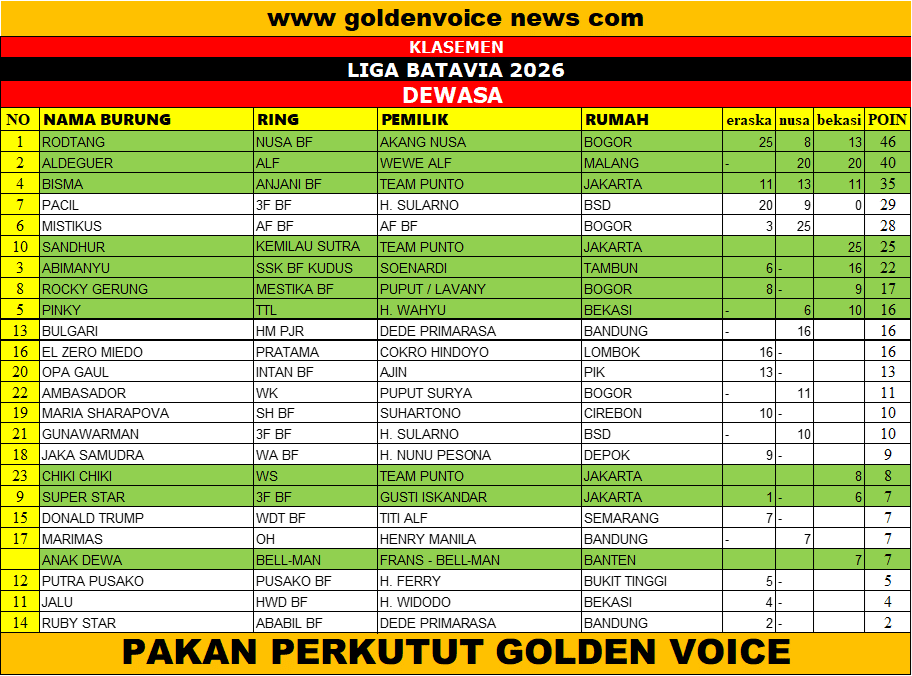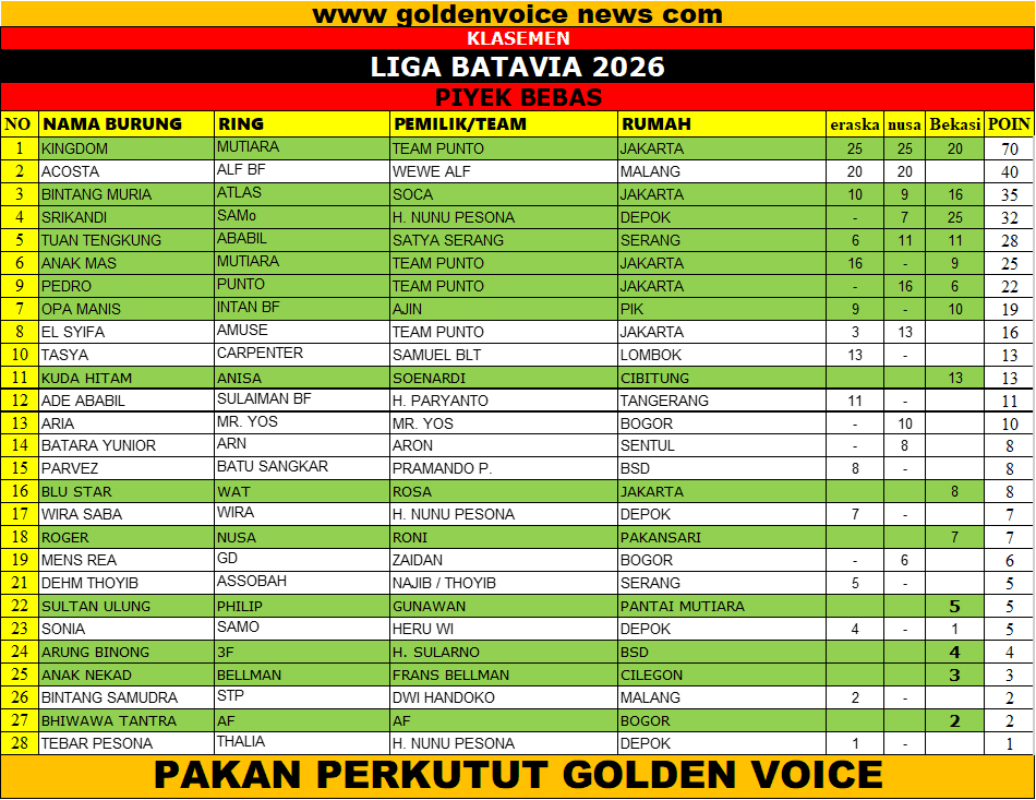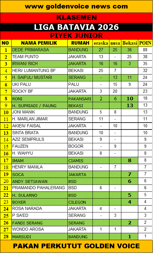 “Liga Batavia 2026 ini sudah terlihat menarik sejak awal, dan ke depan saya yakin akan semakin panas. Apalagi kalau burung-burung jagoan dari 3F seperti Pacil, Gunawarman, dan Gunadarma bisa kembali kerja maksimal, persaingan pasti makin hidup,” ujarnya sa,bil tertawa.