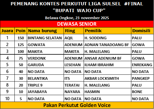Kelas paling bergengsi ini diramaikan burung-burung terbaik dari Palu, Gowa, Enrekang, dan Pangkep. Gelar juara pertama diraih Bintang Selatan milik H. Sodding (Palu) yang tampil stabil sejak awal penilaian. Disusul Gowata milik Adnan Tandaolang BF dan Makita milik H. Maellang.