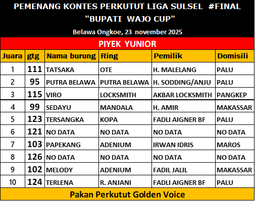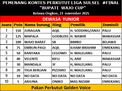 GoldenvoiceNews.com — Lapangan Ongkoe Belawa, Kabupaten Wajo, menjadi pusat perhatian Kung Mania se-Sulawesi pada Minggu siang. Lebih dari 180 ekor perkutut dari berbagai daerah—termasuk Palu, Makassar, Bone, Mamuju, Enrekang, hingga Pangkep—hadir memeriahkan gelaran Liga Sulawesi Seri VII “Bupati Cup”, yang sekaligus menjadi lomba penutup poin Liga Sulsel 2025.