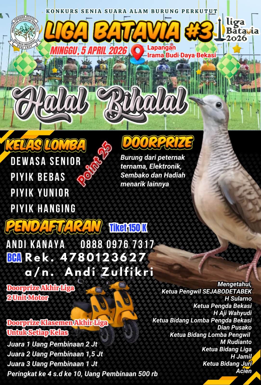 “Habis Ramadan dan Idul Fitri, ini saat yang tepat untuk berkumpul lagi. Selain silaturahmi dan HALAL bi halal, Liga Batavia juga menjadi pemanasan penting sebelum turun di LPI seri perdana Caruban. Biasanya setelah jeda panjang, burung justru tampil lebih maksimal,” ujar H. Sularno.