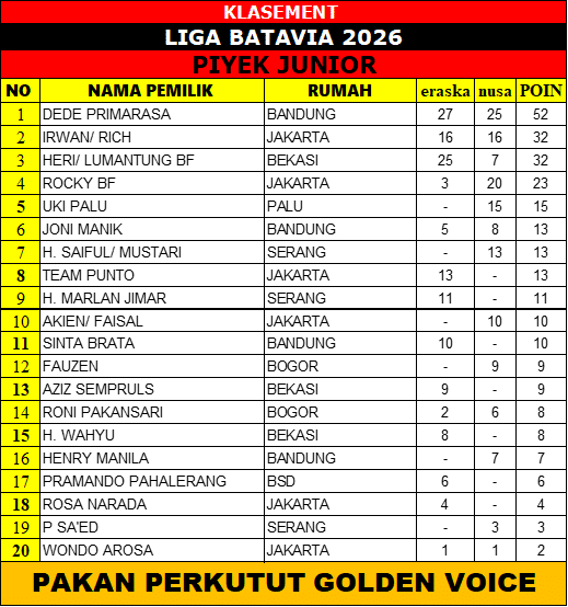 Bidang Lomba pengwil Jabodetabek resmi merilis klasemen Liga Batavia 2026 kelas dewasa, kepas piyek bebas, kelas piyek junior dan kelas piyek hanging , masing-masing mencatat  kumulatif poin dari 2 seri pertandingan. Panas! Itu gambaran persaingan yang terlukis dari ketatnya poin yang dikumpulkan.