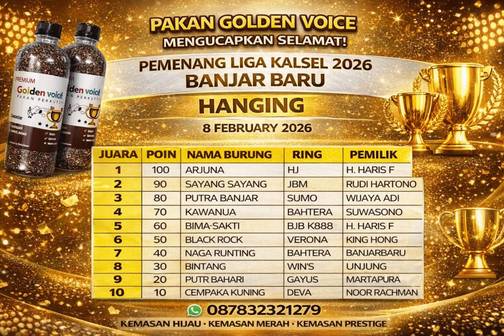 Banjarbaru – Lapangan Perkutut Batu Gunung Mulia Banjarbaru kembali menjadi saksi kompetisi bergengsi kicau mania Kalimantan Selatan. Minggu, 08 Februari 2026, Liga Perkutut Kal-Sel 1 bersama Pengda Banjarbaru digelar dengan meriah, menghadirkan persaingan ketat di tiga kategori: Dewasa Senior, Dewasa Yunior, dan Piyik Hanging.