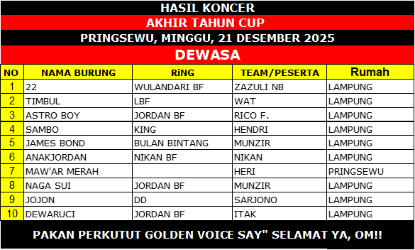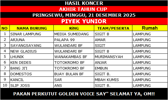 Hingga posisi sepuluh besar, kelas Piyek Yunior menunjukkan pemerataan kualitas. Nama-nama seperti New Gladius, Lhunik, Ken Dedes, hingga Slip Joss membuktikan bahwa regenerasi perkutut Lampung masih terjaga dan menjanjikan untuk musim-musim berikutnya.