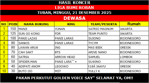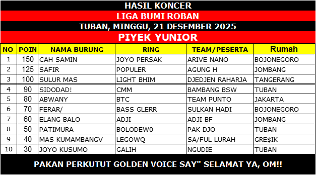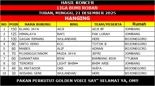 Goldenvoicenews.com – Gelaran Liga Bumi Roban 2025 yang berlangsung pada Minggu, 21 Desember 2025 di Tuban sukses menyedot perhatian kung mania lintas daerah. Persaingan ketat tersaji di tiga kelas utama, yakni Piyek Bebas, Piyek Yunior, dan Piyek Hanging, dengan kualitas burung dan strategi penanganan yang benar-benar diuji hingga babak akhir.