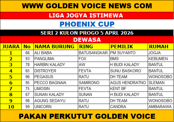 Secara keseluruhan, Phoenix Cup menjadi bukti bahwa Liga Jogja Istimewa terus berkembang, baik dari sisi peserta, kualitas burung, maupun kemasan event. Kombinasi antara persaingan ketat dan nuansa kekeluargaan menjadikan gelaran ini tidak hanya dinanti, tetapi juga dirindukan oleh para kung mania di berbagai daerah.