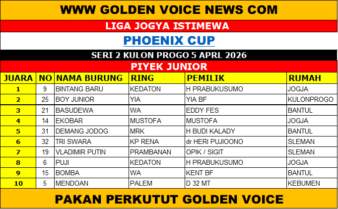 Persaingan di kelas Piyek Yunior pada gelaran Phoenix Cup – Liga Jogja Istimewa Seri 2 menjadi salah satu tontonan paling menarik. Meski dihuni burung-burung muda, kualitas yang ditampilkan tidak bisa dipandang sebelah mata. Justru di kelas inilah terlihat jelas bibit-bibit unggul yang siap menjadi bintang masa depan.