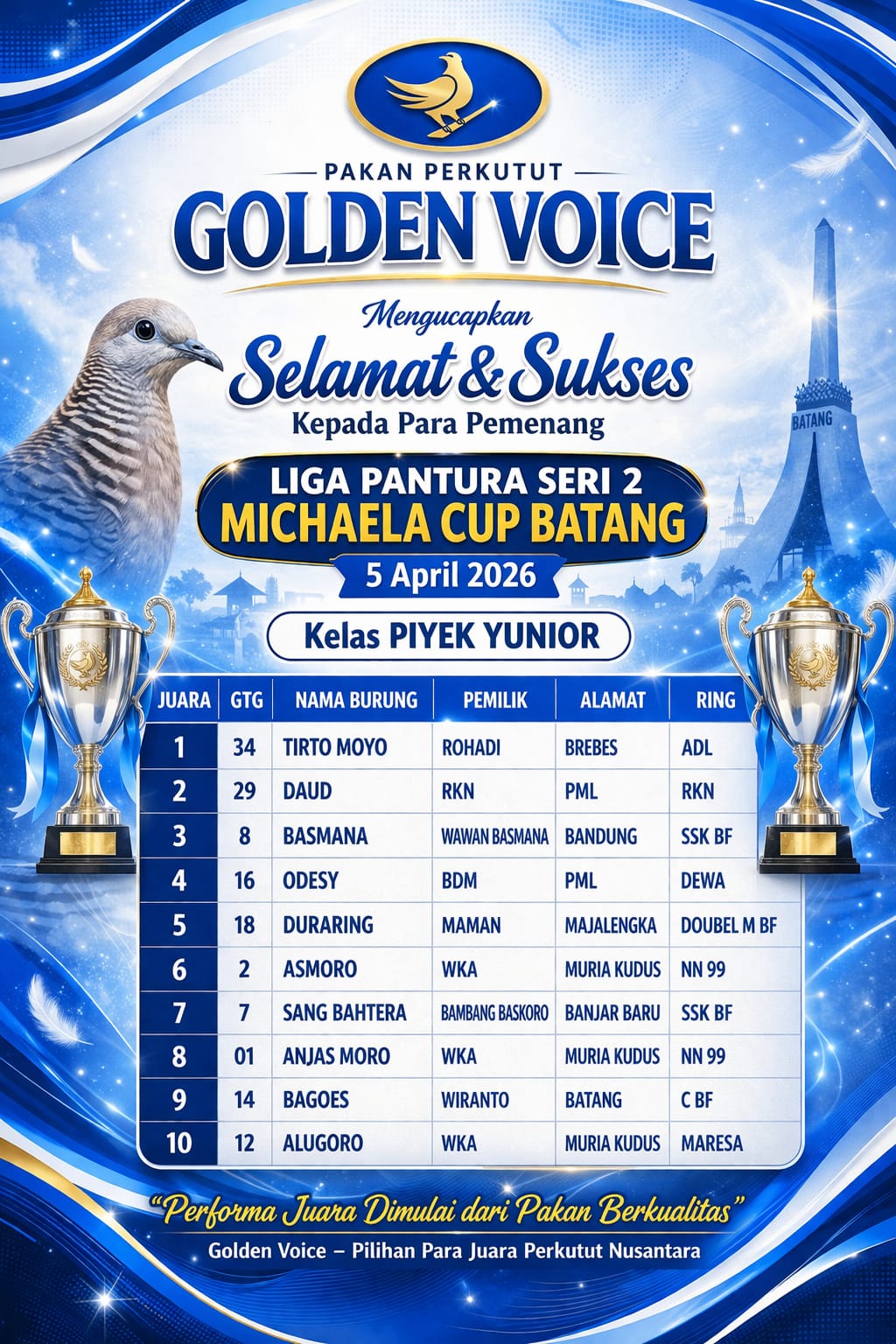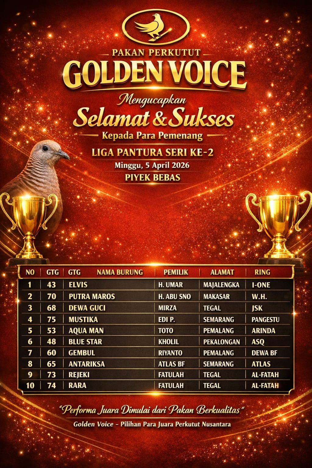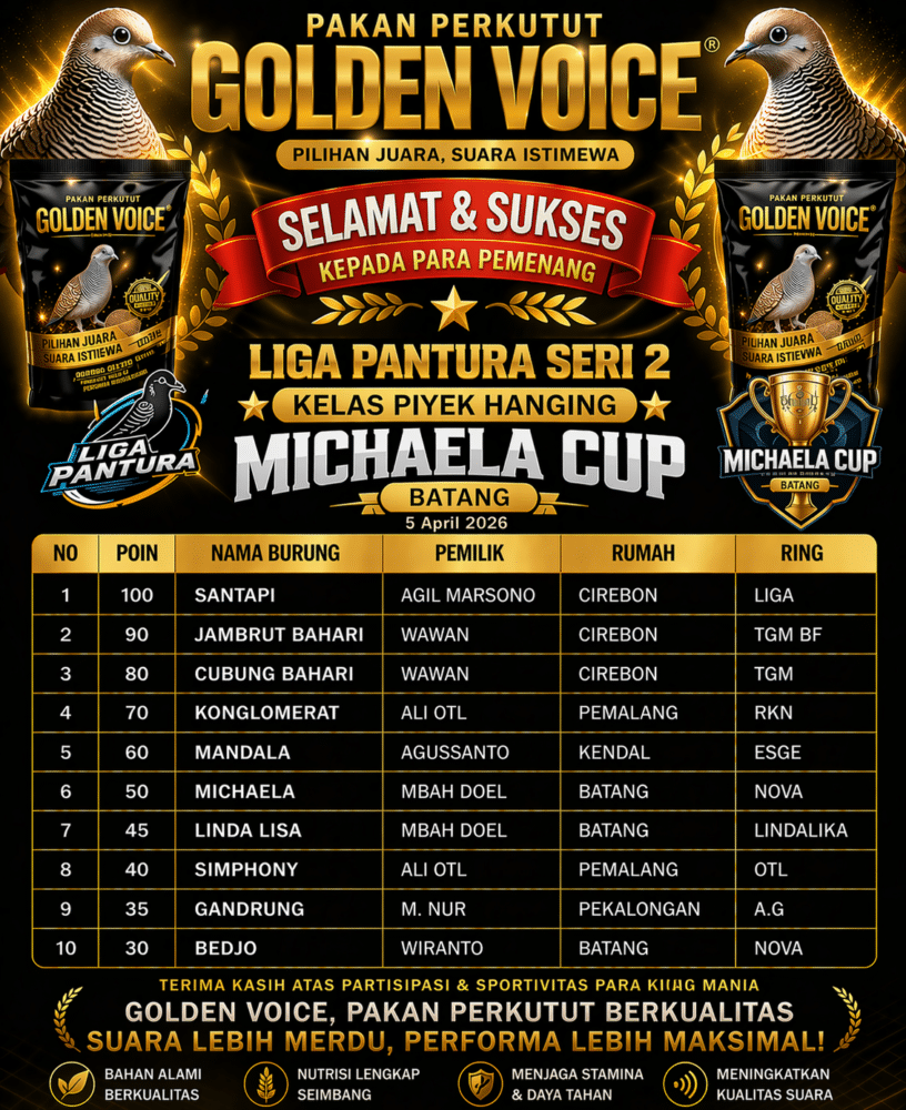 Konsistensi tim kembali dibuktikan oleh Tim Golden Voice Teratai dalam gelaran Liga Pantura Seri 2 Michaela Cup Batang. Meski belum berhasil menempatkan jagoannya di posisi puncak, tim ini justru tampil impresif dengan memborong 5 piala dari 7 burung yang diturunkan.