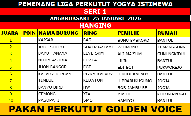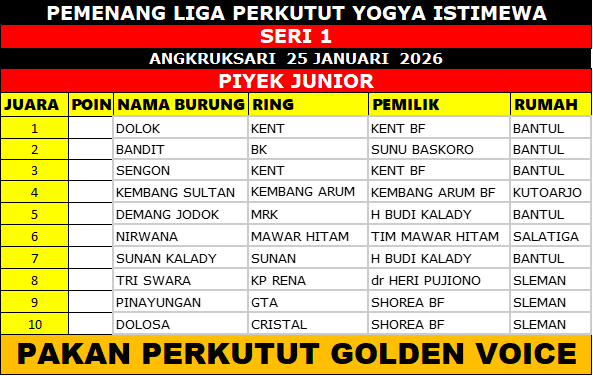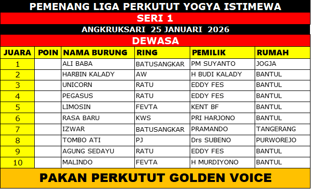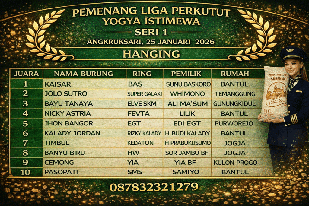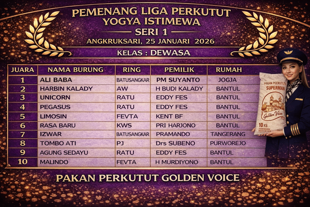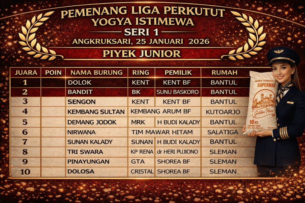 Gelaran Liga Perkutut Yogya Istimewa Seri Perdana yang berlangsung di Angkruksari, Daerah Istimewa Yogyakarta, Minggu (25/01/2026) sukses menyedot perhatian kung mania dari berbagai daerah. Event pembuka ini menjadi bukti nyata bahwa antusiasme dan gairah lomba perkutut di wilayah DIY masih sangat kuat dan terus berkembang.