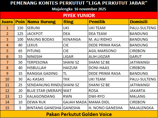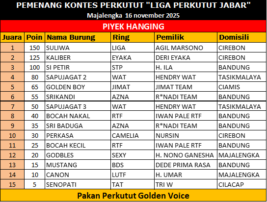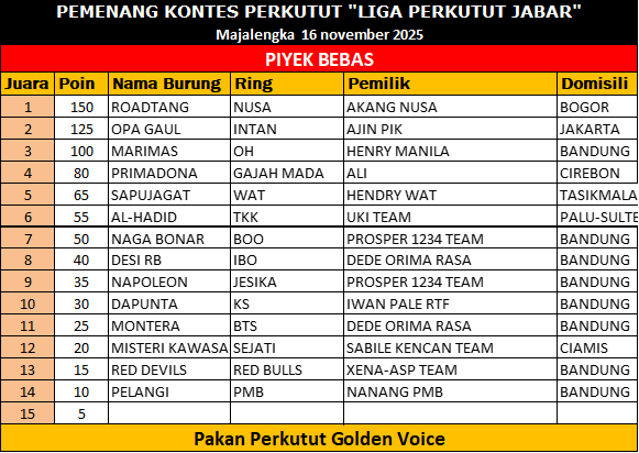 Sebagai stokis pakan Golden Voice, H. Nono juga tak lupa mengapresiasi dukungan komunitas perkutut terhadap produk lokal berkualitas yang kini makin dipercaya para peternak dan penghobi. Gelaran LPJB #9 Jatiwangi–Majalengka menjadi penutup manis perjalanan liga 2025. Para juara telah menorehkan prestasi terbaik, dan kung mania berharap tahun depan kompetisi semakin meriah.