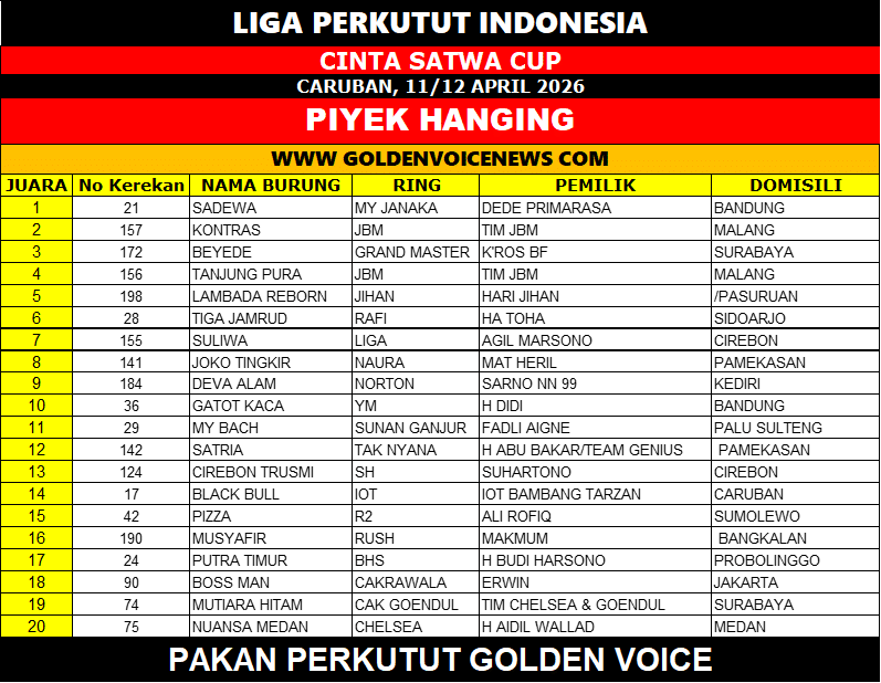 Kelas Piyek Hanging menjadi panggung dominasi Sadewa, burung milik Dede Primarasa dari Bandung. Dengan performa istimewa, Sadewa tampil paling menonjol dan sukses mengunci posisi juara pertama.
