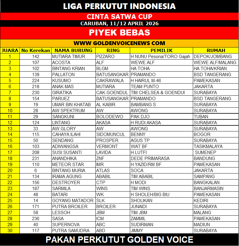 Kemenangan ini semakin menegaskan kekuatan tim Dede Primarasa yang sebelumnya juga tampil apik di kelas junior. Konsistensi lintas kelas menjadi bukti kualitas perawatan dan materi burung yang dimiliki.