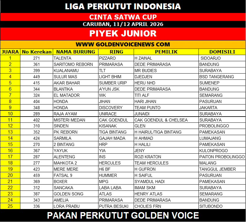 Di kelas Piyek Junior, Talenta milik H. Zainal dari Sidoarjo tampil impresif dan sukses merebut posisi puncak. Nama “Talenta” seolah menjadi representasi performanya yang menonjol di antara burung-burung muda lainnya.