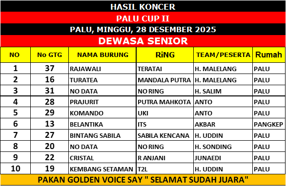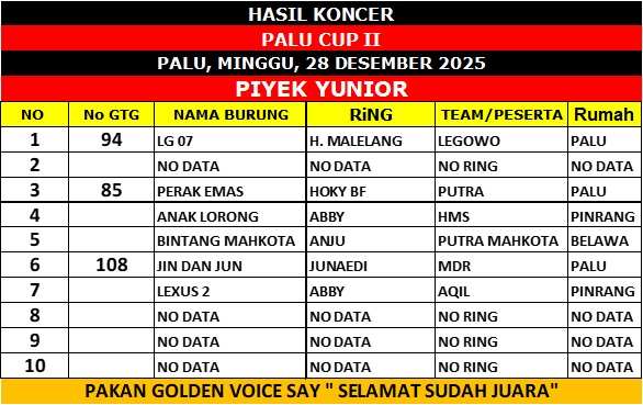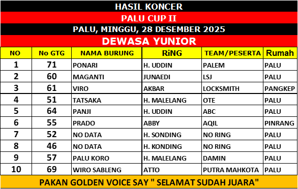 Goldenvoicenews.com-Gelaran Palu Cup II yang diselenggarakan oleh Persatuan Pelestari Perkutut Seluruh Indonesia (P3SI) Pengda Palu, Minggu, 28 Desember 2025, berlangsung sukses dan menyedot antusiasme tinggi kung mania Sulawesi Tengah dan sekitarnya. Bertempat di Palu, lomba ini menjadi ajang pembuktian kualitas burung-burung terbaik di tiga kelas utama: Dewasa Senior, Dewasa Junior, dan Piyik Junior.