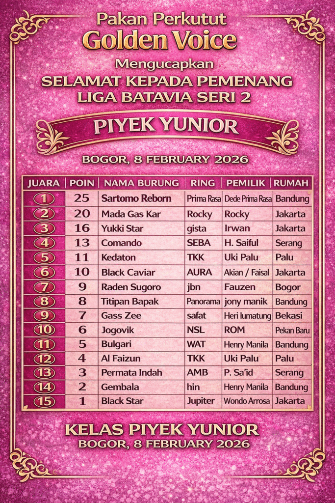 Sejak awal penilaian, Sartomo Reborn tampil stabil. Materi suara yang bersih, ritme terjaga, serta kerja yang konsisten membuatnya terus berada di papan atas hingga peluit akhir. Total 25 poin yang diraih memastikan tak ada pesaing yang mampu mendekat, sekaligus menegaskan kualitas ring Prima Rasa di jalur piyek muda.