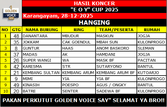 Karanggayam kembali menegaskan diri sebagai salah satu barometer lomba perkutut di DIY, dan kung mania pun pulang dengan kepuasan—baik yang membawa piala, doorprize, maupun sekadar pengalaman berharga di gantangan.
